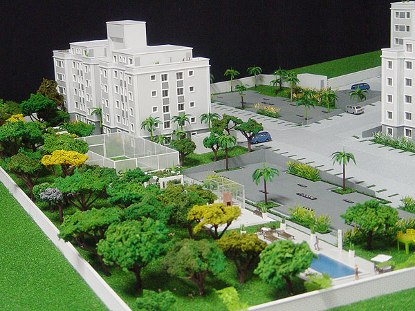 Apresentação de condomínio fechado com blocos residenciais e área de lazer para comercialização junto ao público alvo.