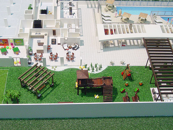 Apresentação de condomínio fechado com torres residenciais e área de lazer para comercialização junto ao público alvo.