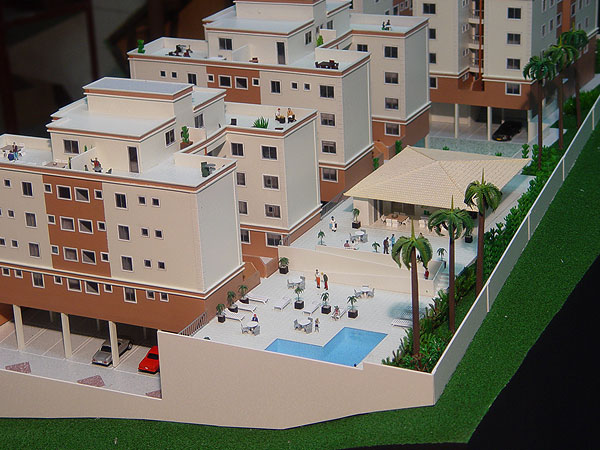 Apresentação de condomínio fechado com blocos residenciais e área de lazer para comercialização junto ao público alvo.